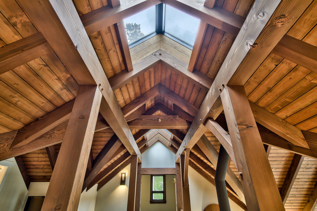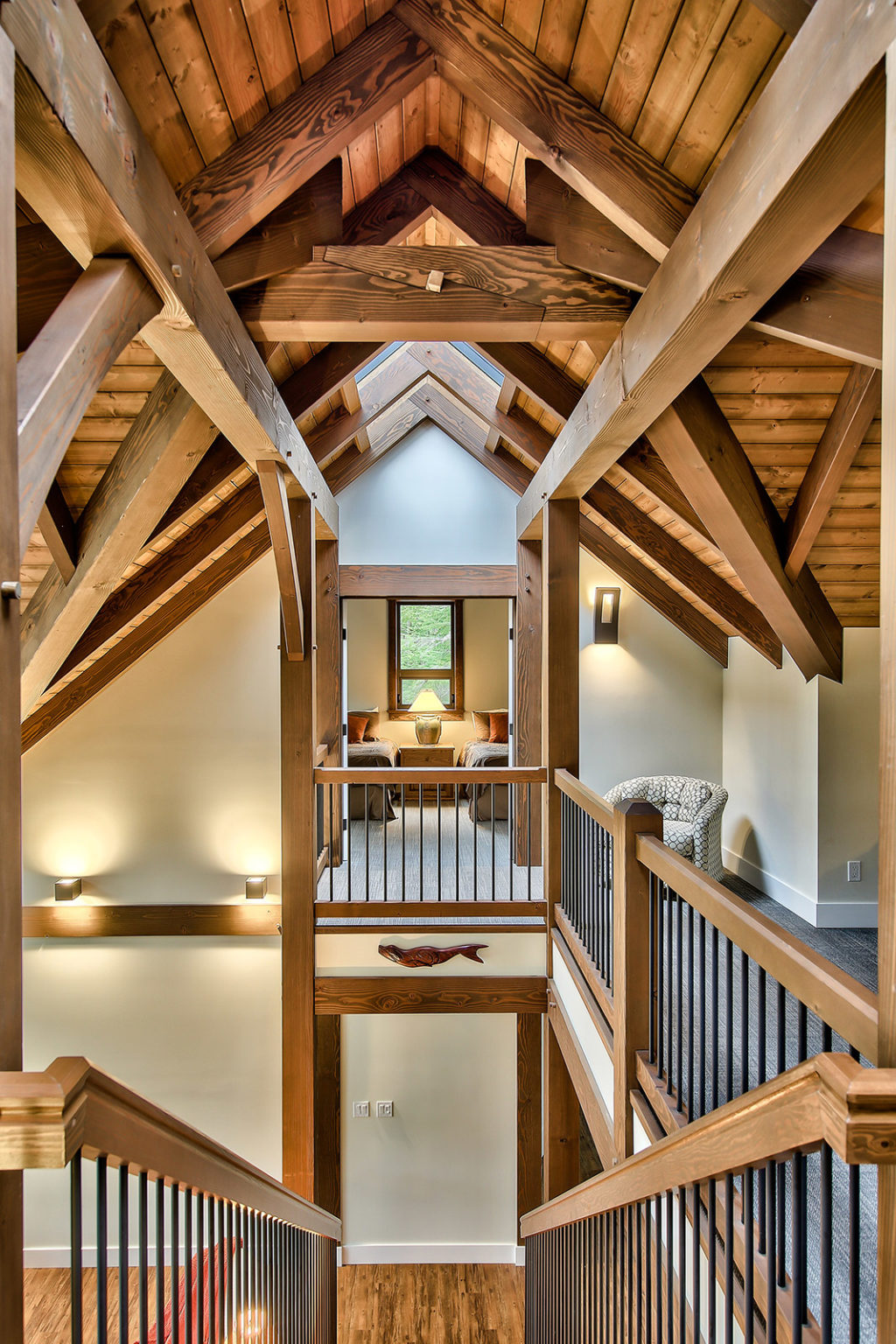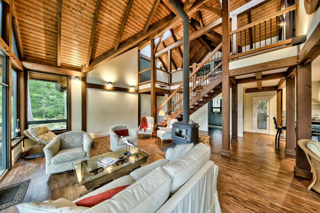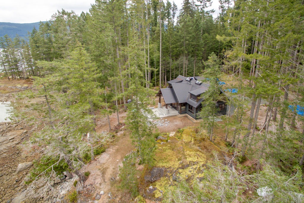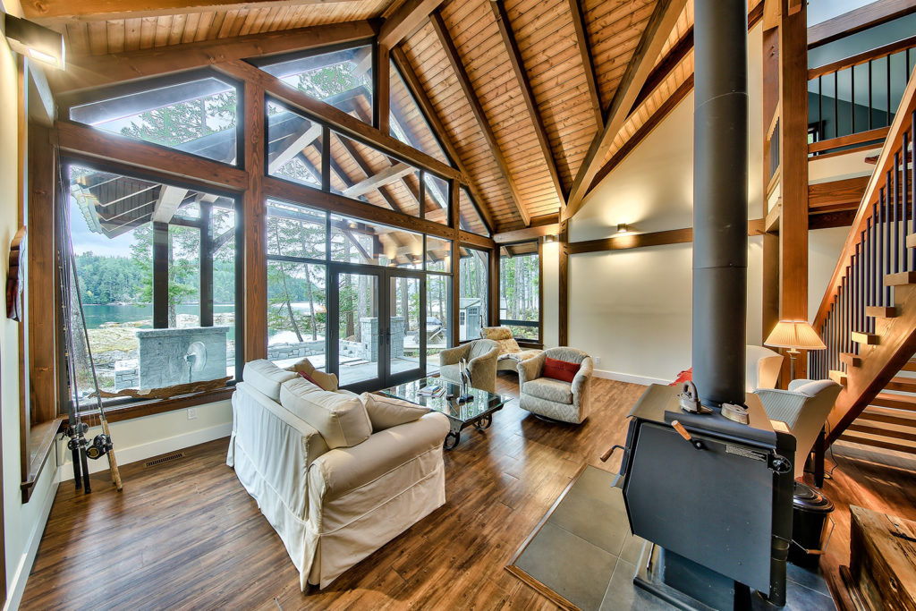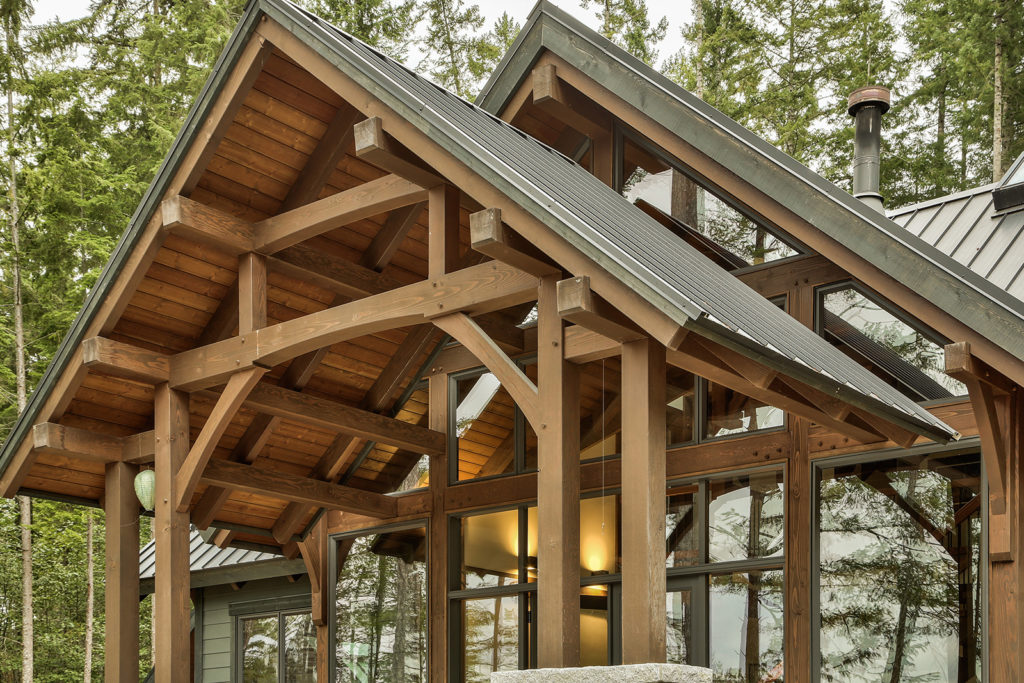 Anyone having the fortune to visit this remote island home would be amazed by the full amenities and creature comforts incorporated into this home. The large covered porch provides plenty of shelter at this often rainy location but still lets in plenty of natural light. The timber-frame is a hybrid approach with timberwork concentrated in the common spaces and private spaces (bedrooms, bathrooms, utility) are conventionally framed. Because of the remote location, erection of the timber frame was completed without the use of a crane. Just ingenuity.