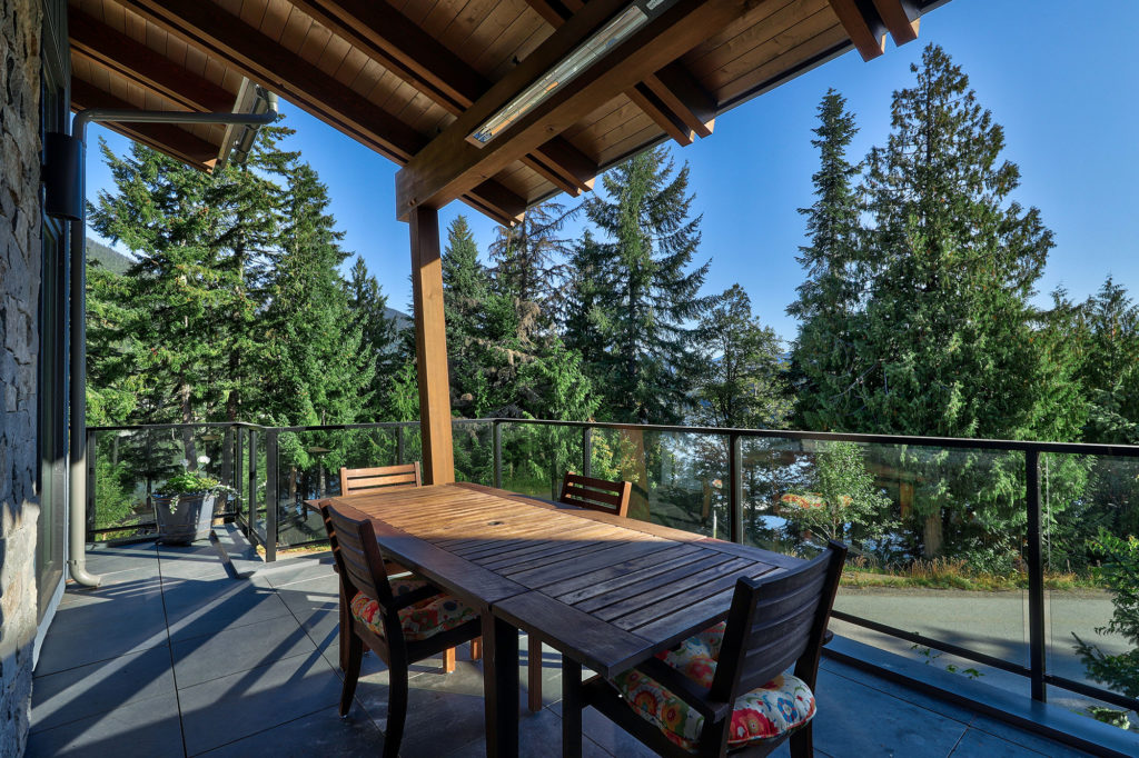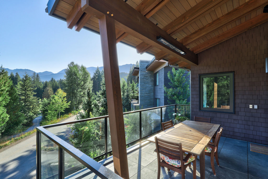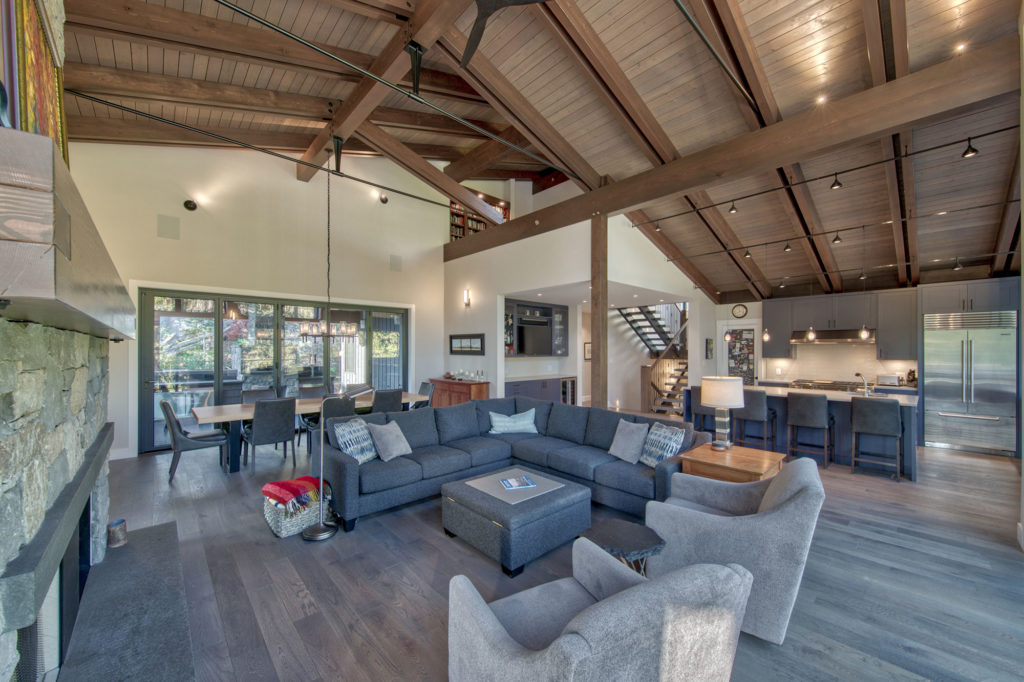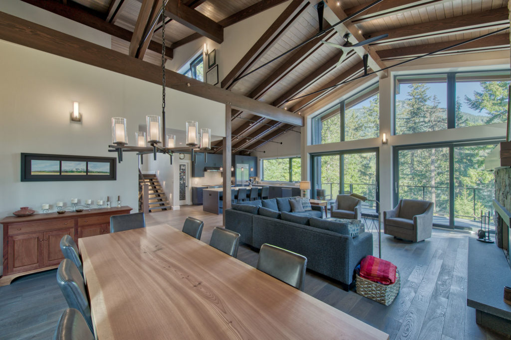 This was one of our favourite projects. Built for a long time friend and Queen’s engineering classmate of KRT founder, Dave Petrina the home was one of the more contemporary projects we’ve done. Kettle River played a creative role in the timber design including coming up with the unique steel-timber truss design. Kettle River also designed and built the beautiful open timber staircase incorporating oak treads with Douglas fir stringers stained black to complement the steel elements throughout the house. The balustrade on the stairs was carefully chosen to mirror the ironwork on the trusses in the greatroom. Designing elegant timberwork for the Whistler climate is always a challenge as the massive snow loads often result in very chunky timber frames. The use of the double rafters and the steel tension chord on the truss helped to keep the chunkiness in check.