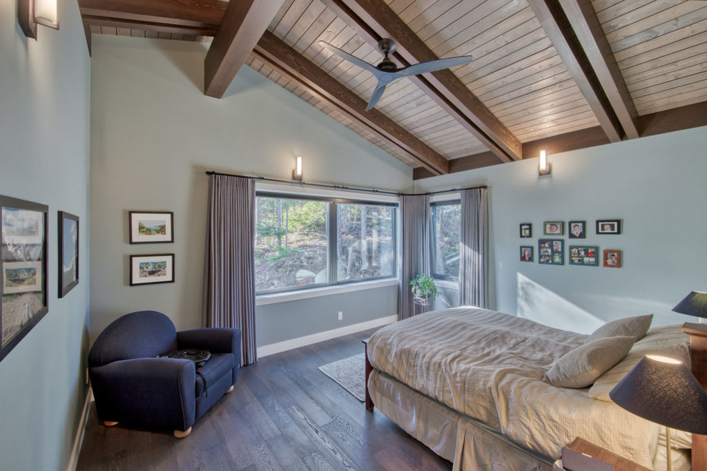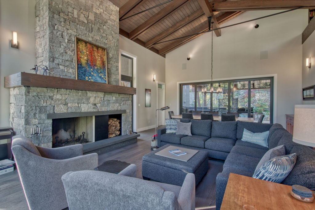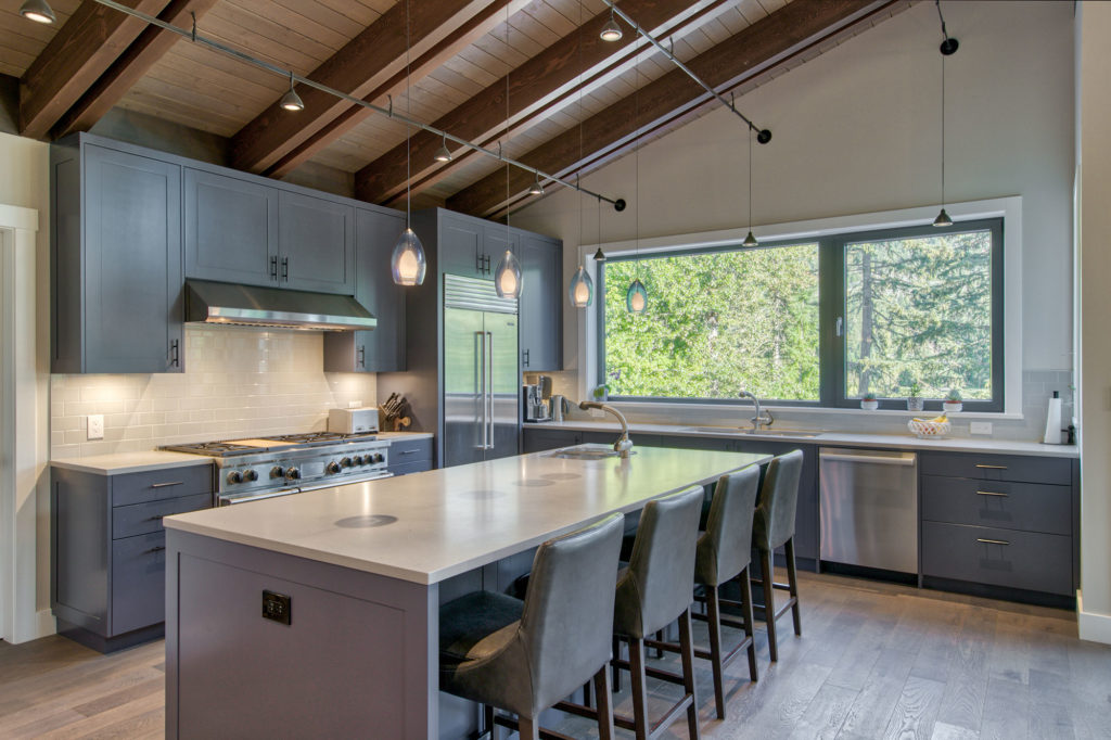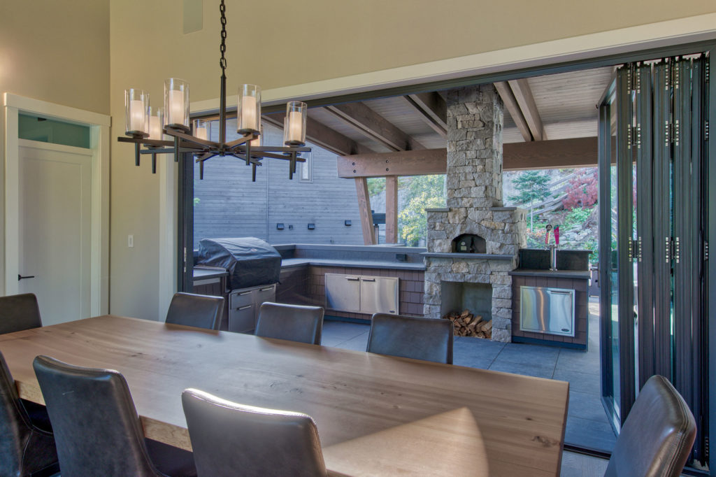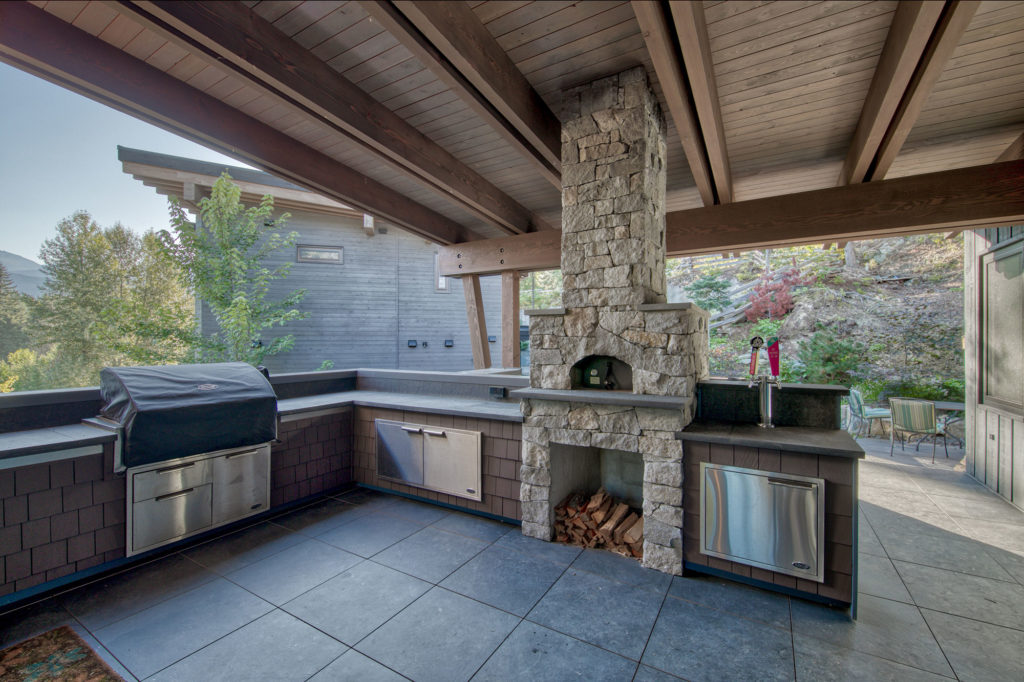 This was one of our favourite projects. Built for a long time friend and Queen’s engineering classmate of KRT founder, Dave Petrina the home was one of the more contemporary projects we’ve done. Kettle River played a creative role in the timber design including coming up with the unique steel-timber truss design. Kettle River also designed and built the beautiful open timber staircase incorporating oak treads with Douglas fir stringers stained black to complement the steel elements throughout the house. The balustrade on the stairs was carefully chosen to mirror the ironwork on the trusses in the greatroom. Designing elegant timberwork for the Whistler climate is always a challenge as the massive snow loads often result in very chunky timber frames. The use of the double rafters and the steel tension chord on the truss helped to keep the chunkiness in check.