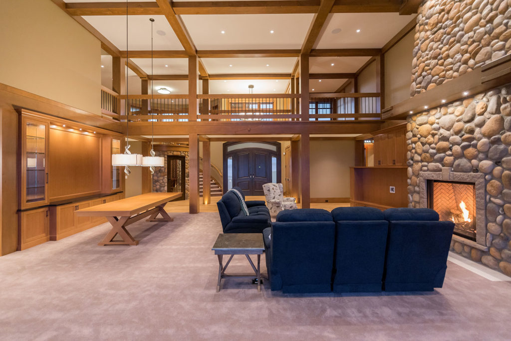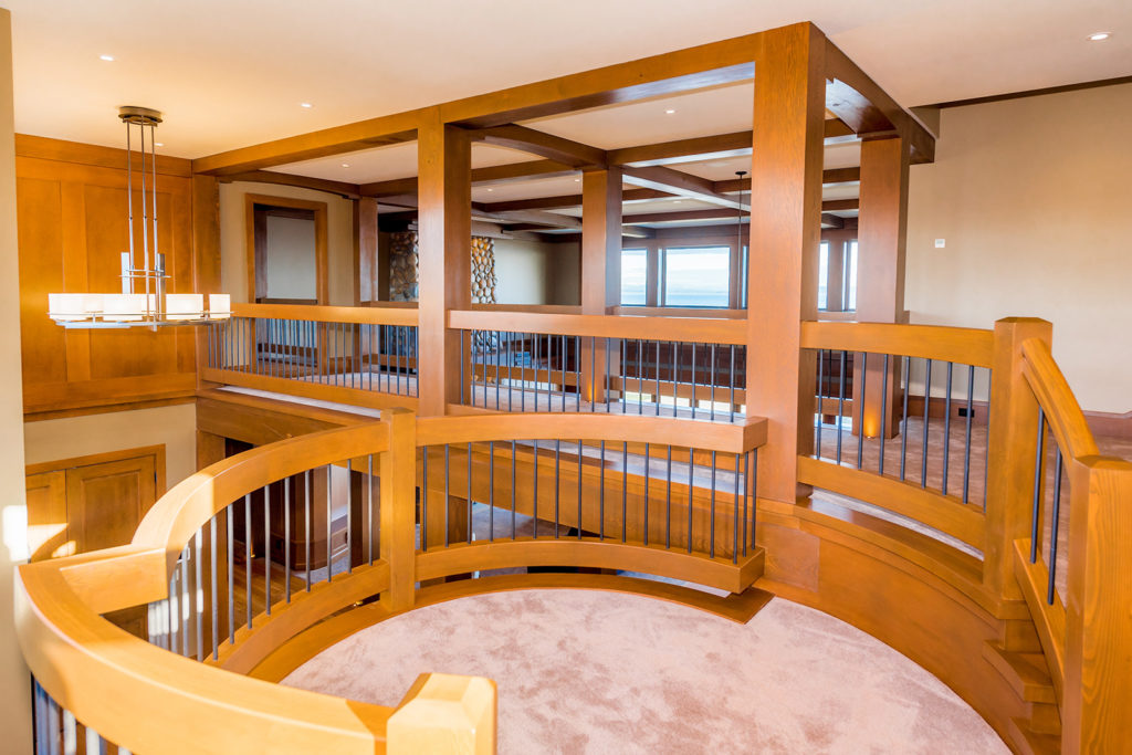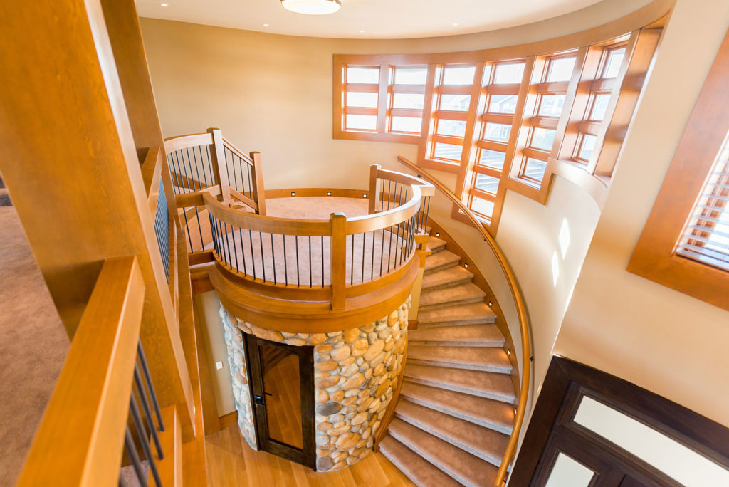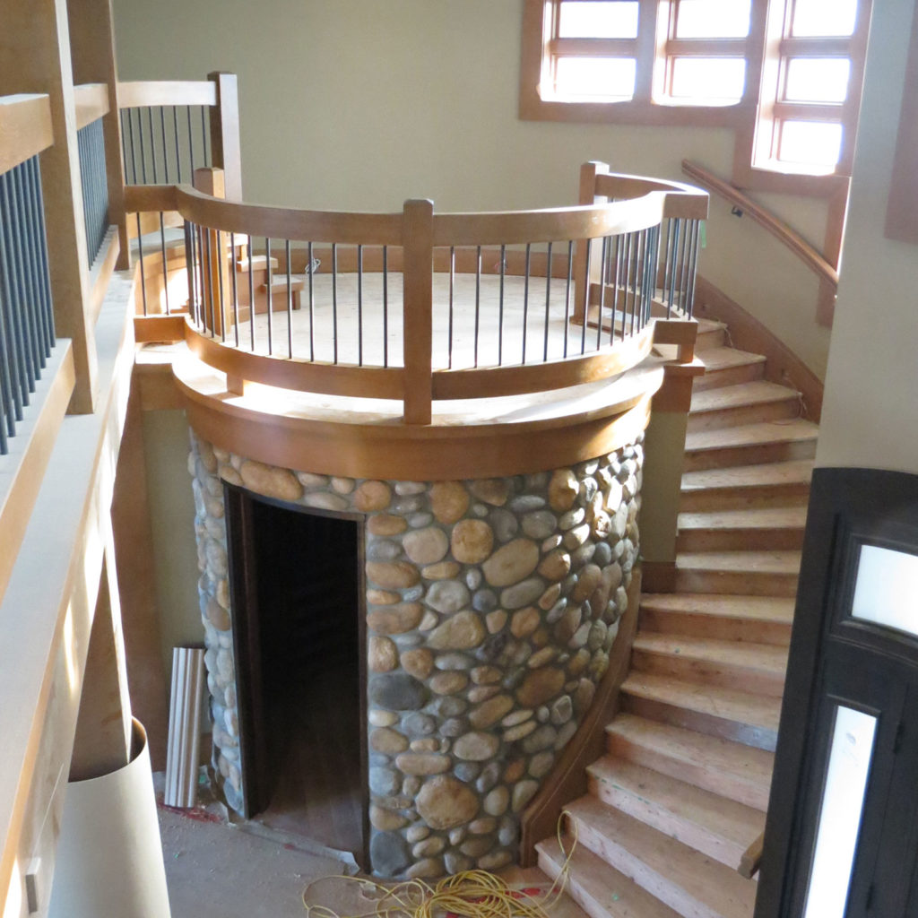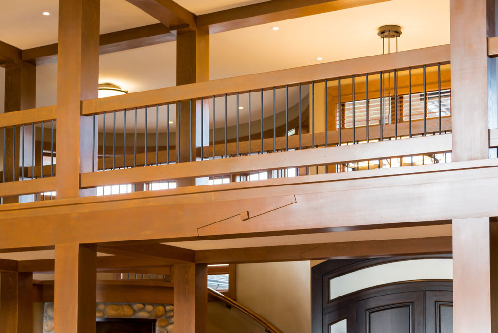 This project presented an interesting challenge for Kettle River. The project was designed with exposed-timber structure. Unfortunately, the initial framers installed timbers that were too small and poor quality for such a significant home. Our solution was to ‘wrap’ and mitre all the timbers with quality timber material. This solved 2 problems, first, it made the timber work in appropriate scale with the house and second, it raised the timber quality to a suitable architectural level. In addition, Kettle River detailed and installed the curved railings and balustrade.