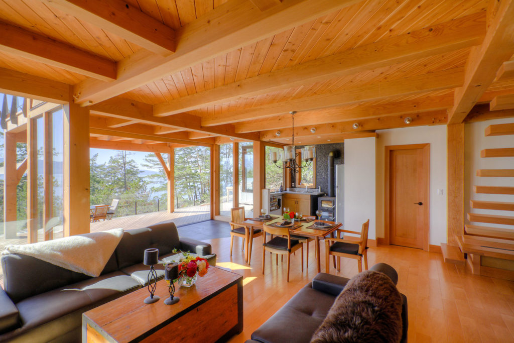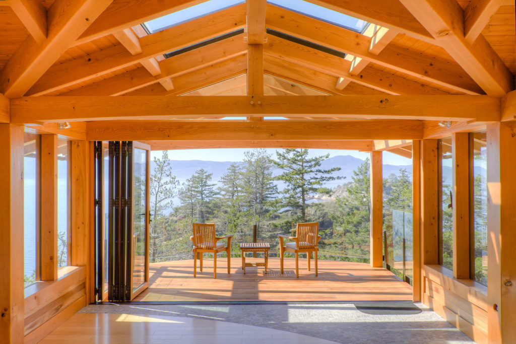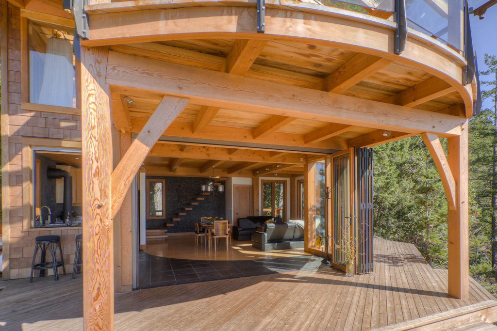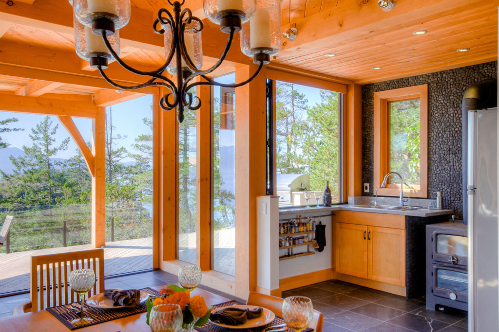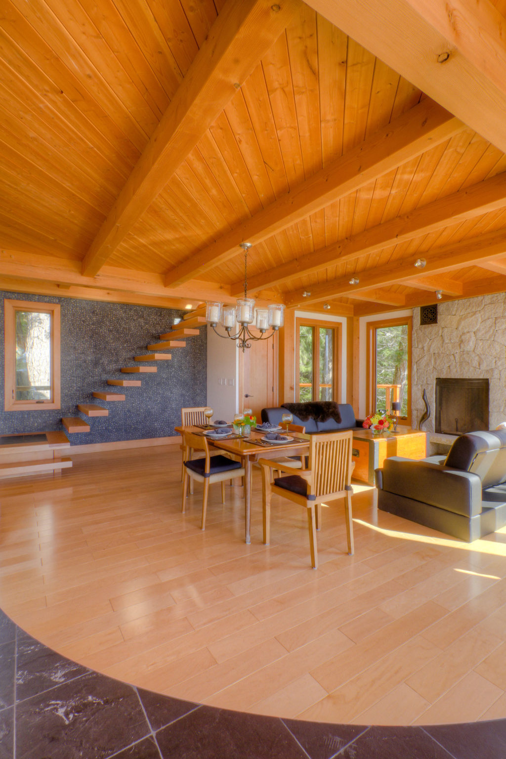 Janine Vertone, West Vancouver, BCKettle River did it all on our remote water access property: from site prep through helicopter staging, to the fine details of finishing carpentry. The design and engineering phase was creative, inspiring and thorough. With a detailed plan in place and beautiful microwaved CNC-cut timbers delivered by barge, they lived on boats or in tents and worked very long days to put together a little timber frame masterpiece. They installed a big Rumford fireplace, filled in the glazing and the SIPS, built a totally unconventional set of stairs and made the maple hardwood floor match the curved tiling in the kitchen and bath. Everything about this whole experience was extraordinary!