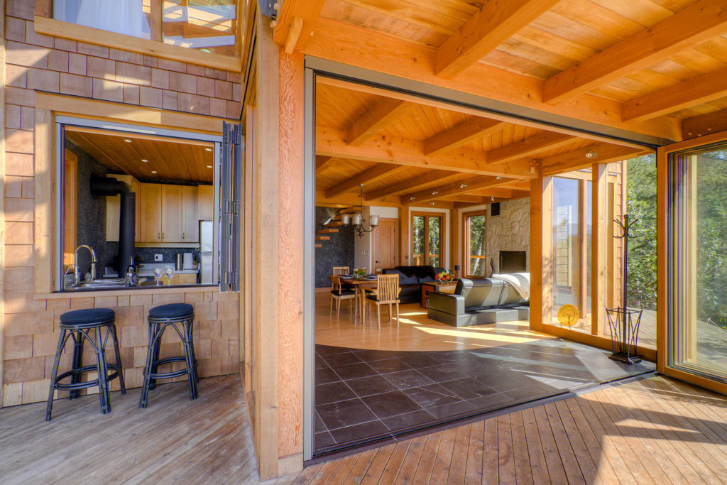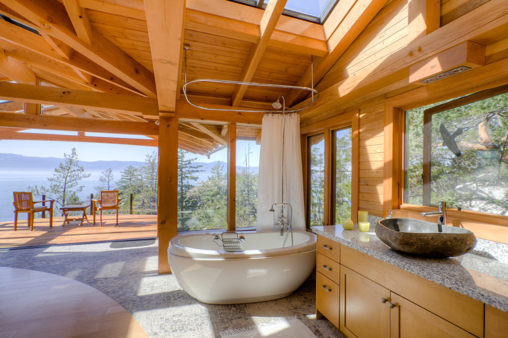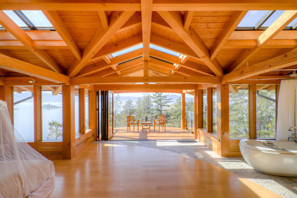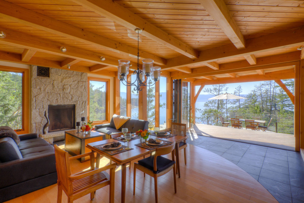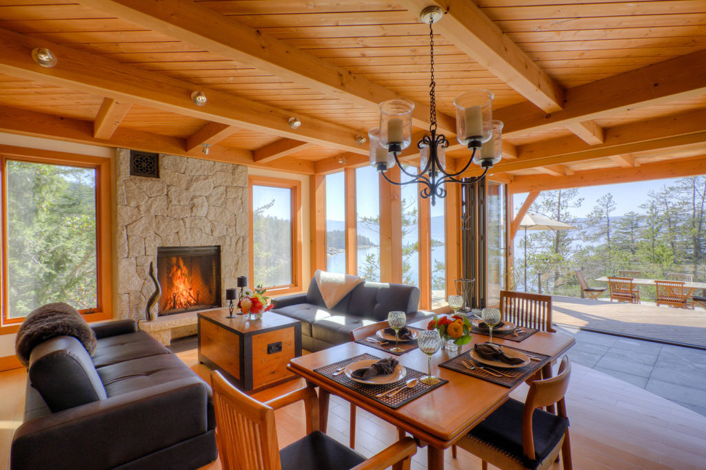 Janine Vertone, West Vancouver, BCKettle River did it all on our remote water access property: from site prep through helicopter staging, to the fine details of finishing carpentry. The design and engineering phase was creative, inspiring and thorough. With a detailed plan in place and beautiful microwaved CNC-cut timbers delivered by barge, they lived on boats or in tents and worked very long days to put together a little timber frame masterpiece. They installed a big Rumford fireplace, filled in the glazing and the SIPS, built a totally unconventional set of stairs and made the maple hardwood floor match the curved tiling in the kitchen and bath. Everything about this whole experience was extraordinary!