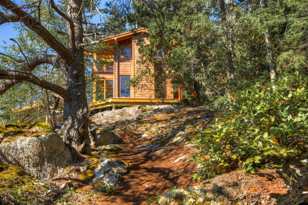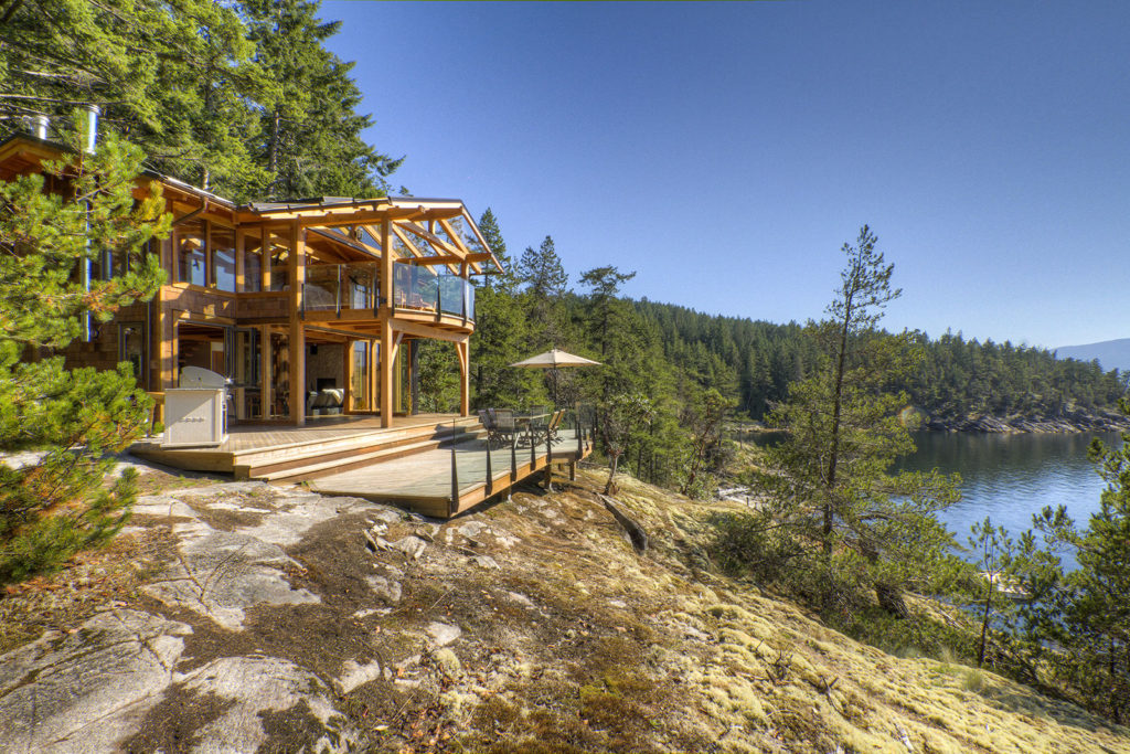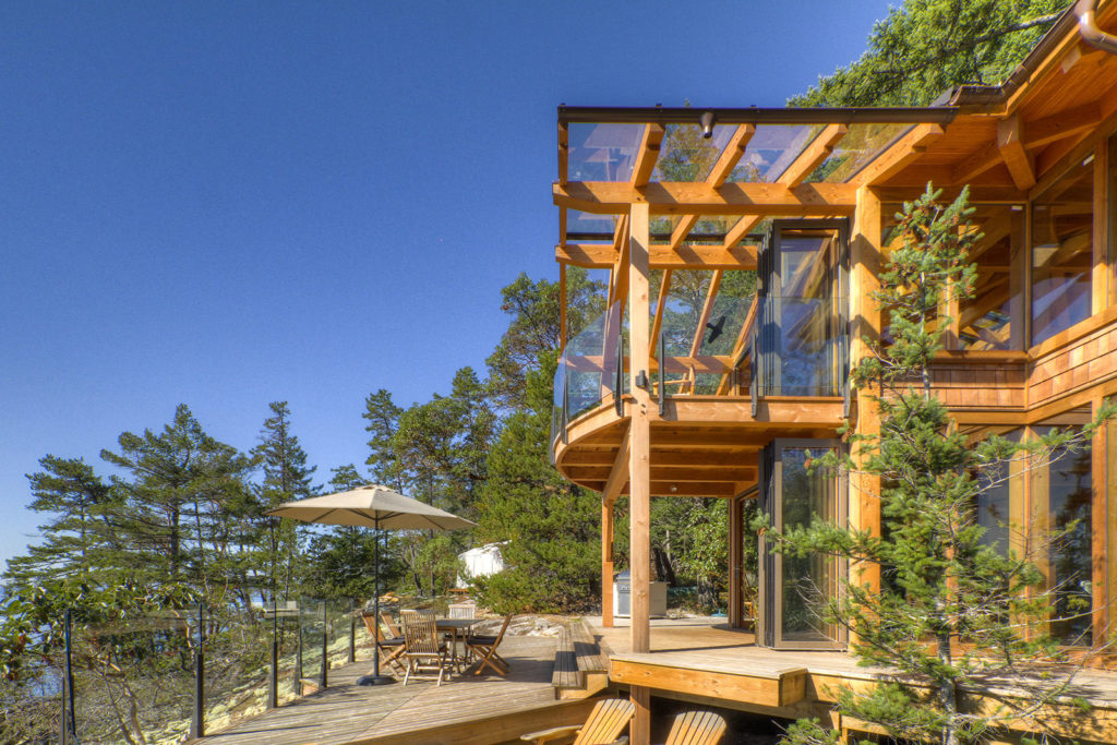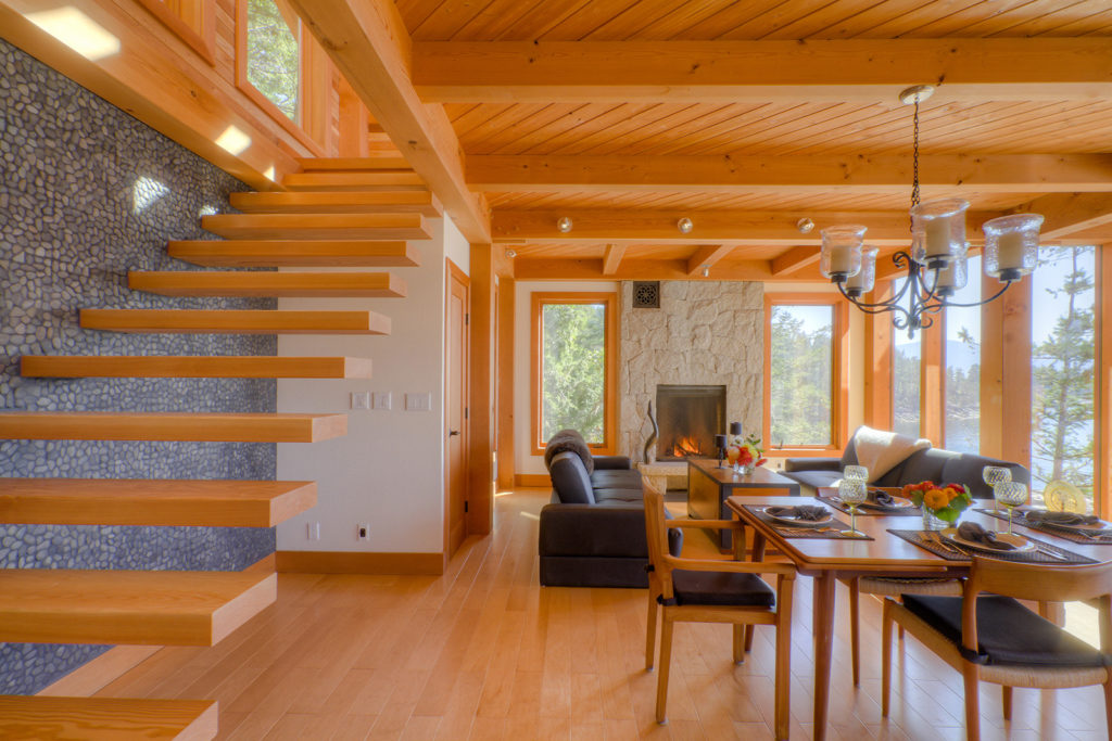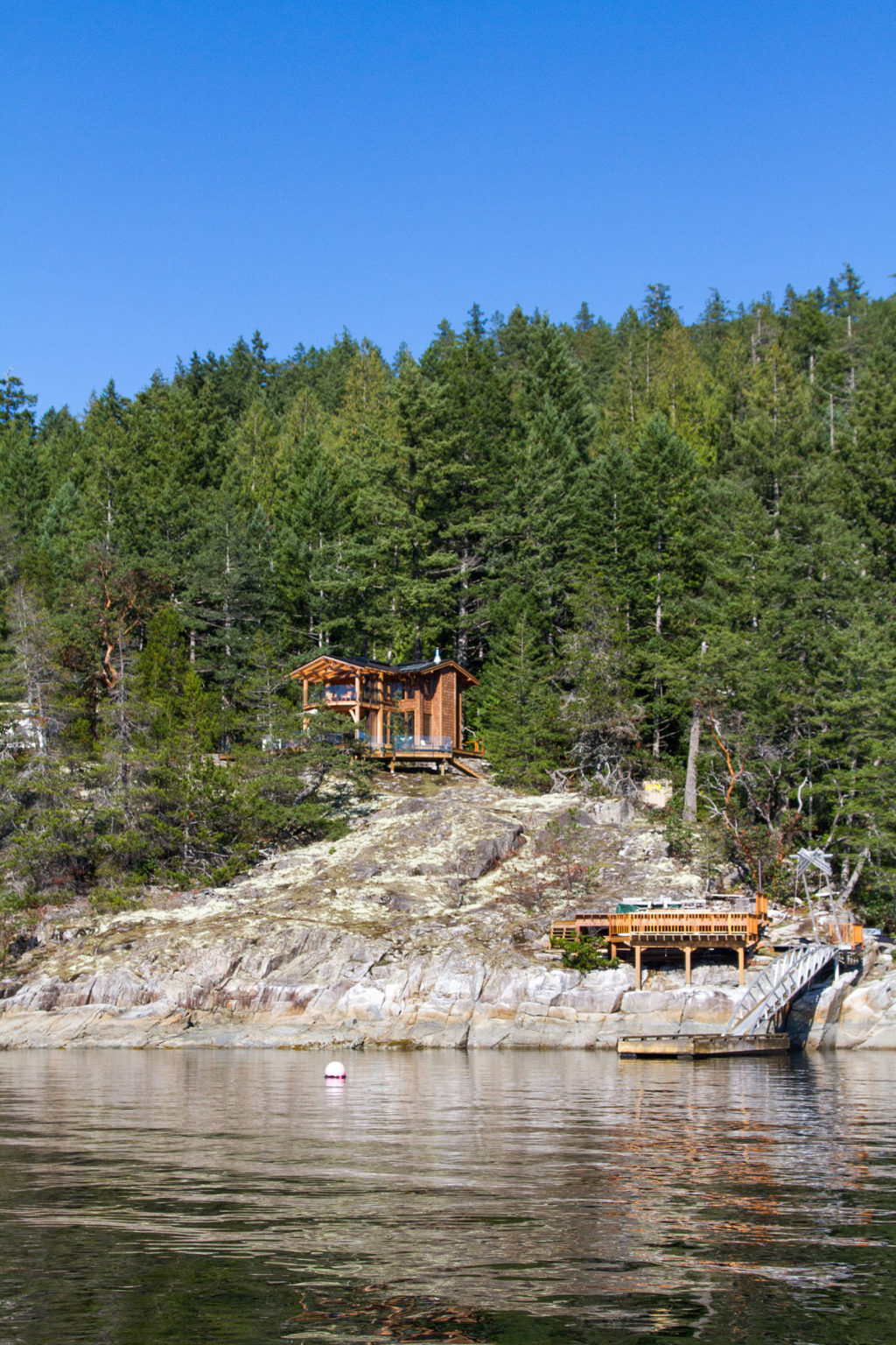 All materials were barged to the island and then choppered from the barge to the building site on the bluff overlooking the water. The project is completely off-grid – rainwater recovery and filtration, solar power, composting toilets and firewood heating. A unique ‘cantilevered’ staircase projects from the wall. Extensive glasswork and skylights give this cabin panoramic views of the ocean and the stars at night.