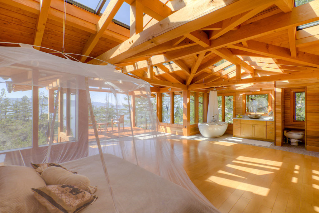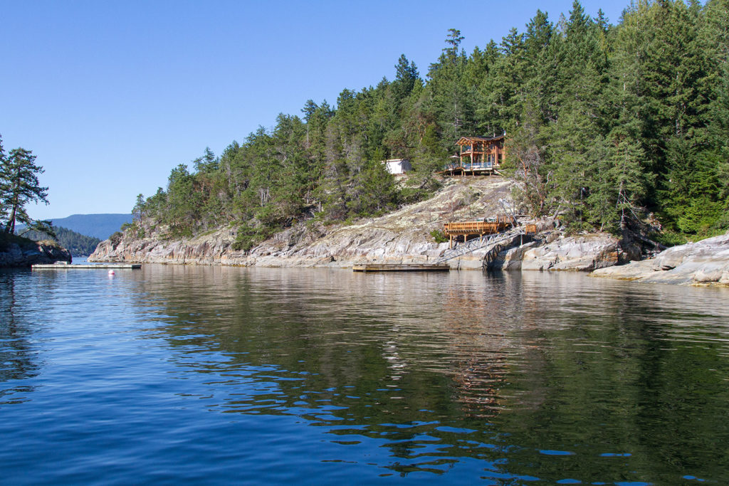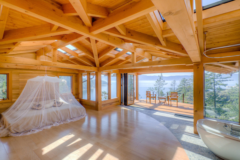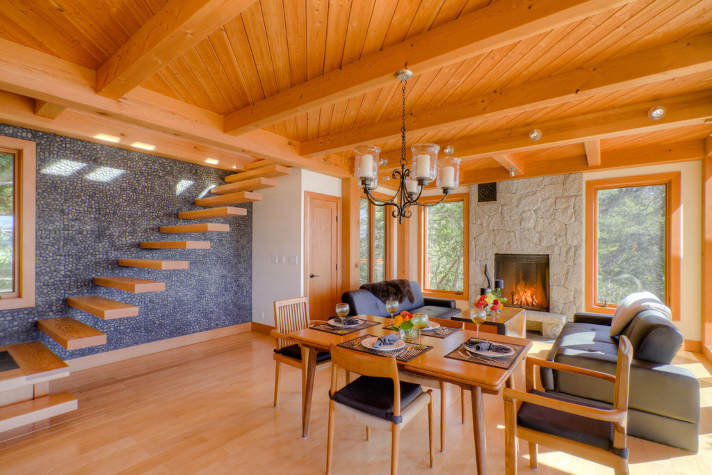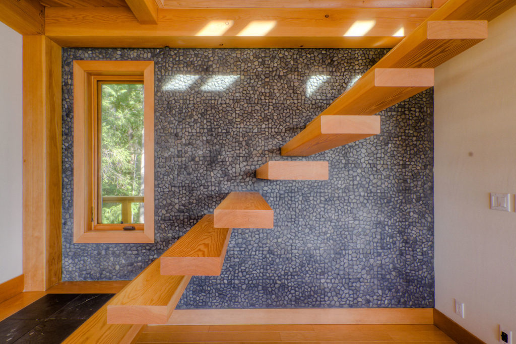 All materials were barged to the island and then choppered from the barge to the building site on the bluff overlooking the water. The project is completely off-grid – rainwater recovery and filtration, solar power, composting toilets and firewood heating. A unique ‘cantilevered’ staircase projects from the wall. Extensive glasswork and skylights give this cabin panoramic views of the ocean and the stars at night.
