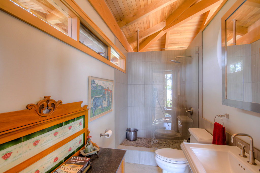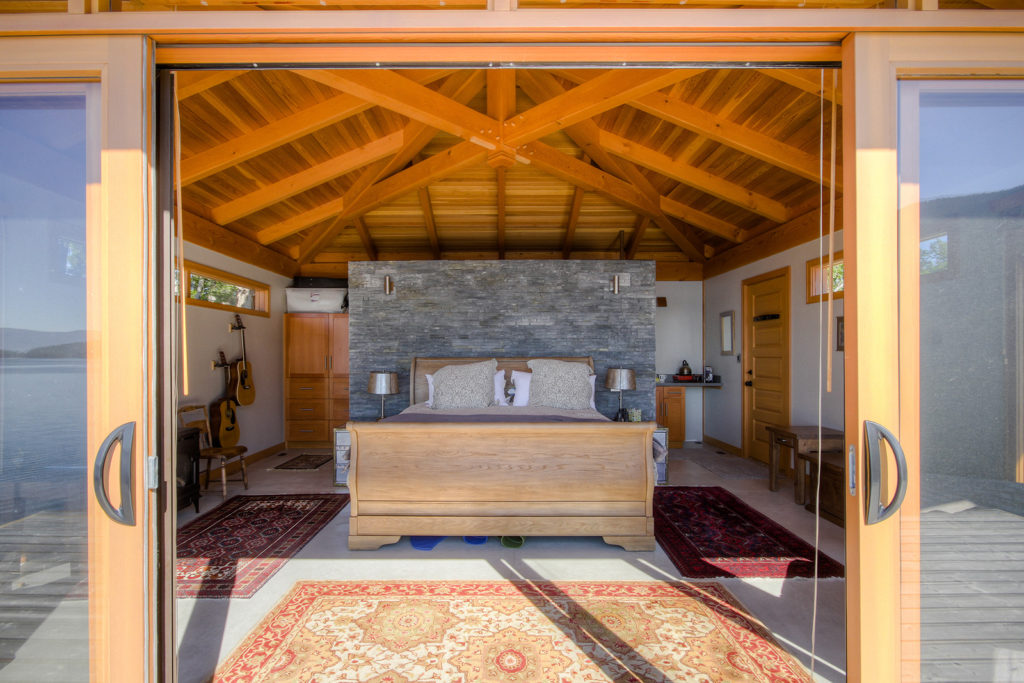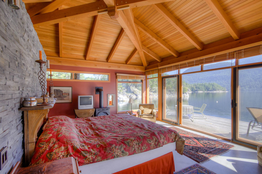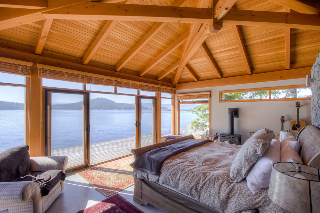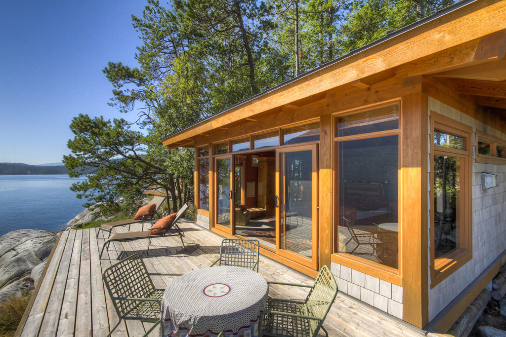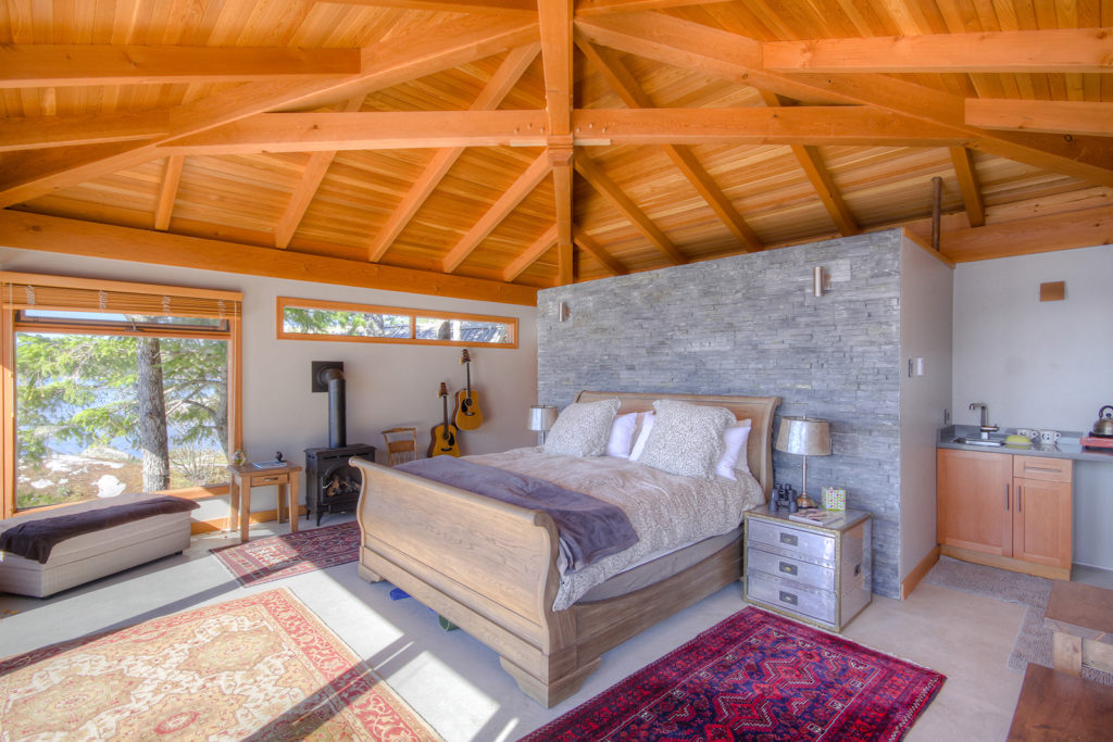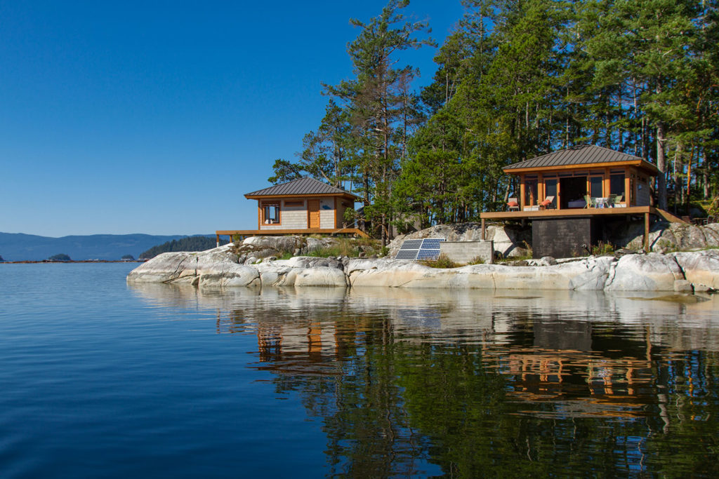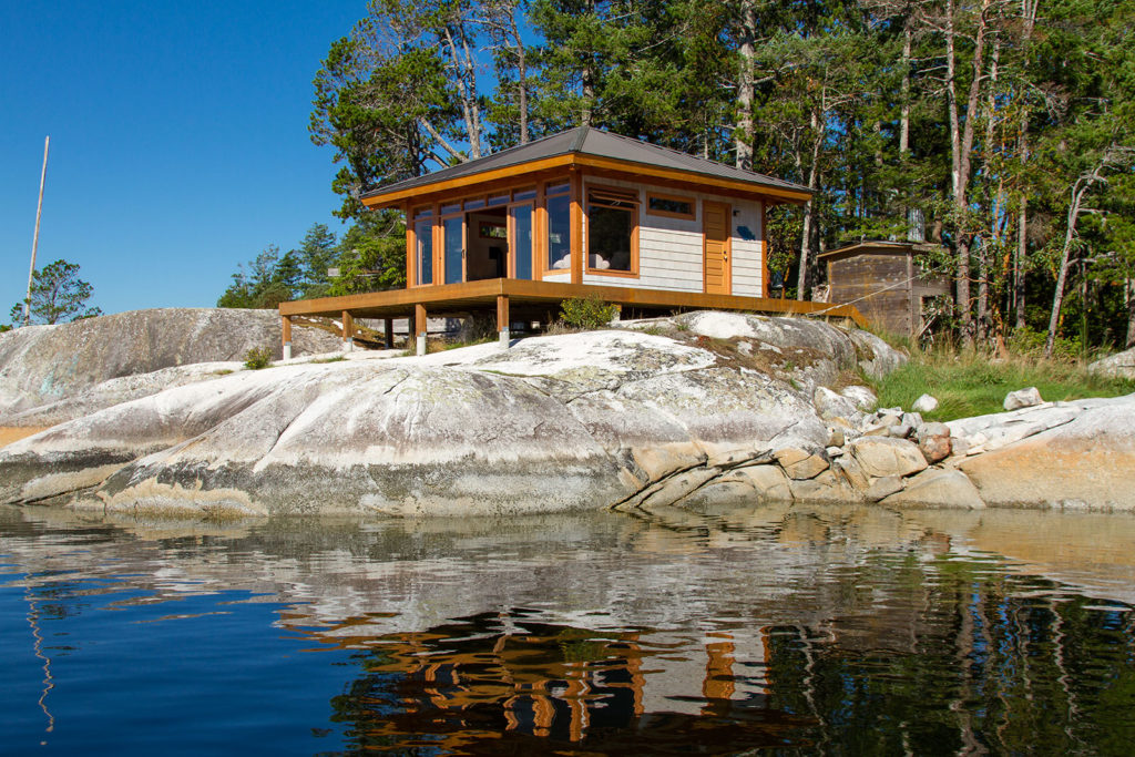 Sometimes simple is better. For this project, our clients wanted 2 simple 20ft x 20ft sleeper cabins to provide shelter and comfort on this 1-acre private island. The cabins were pre-fabricated, barged to the site and assembled during a couple of snowy weeks in January. The big overhanging hip roofs with cedar ceilings provide plenty of shelter on the often rainy Sunshine Coast.