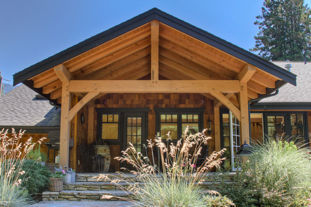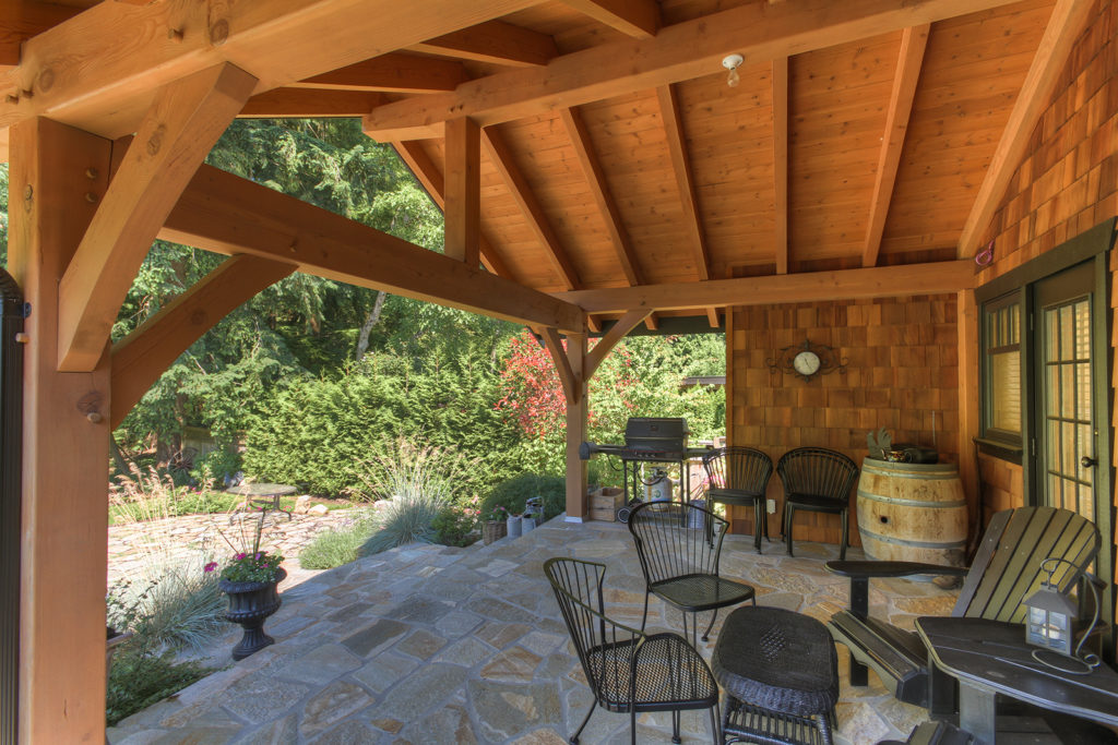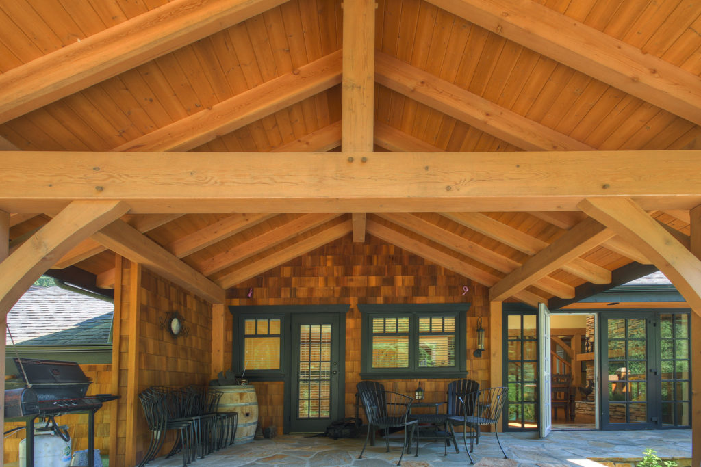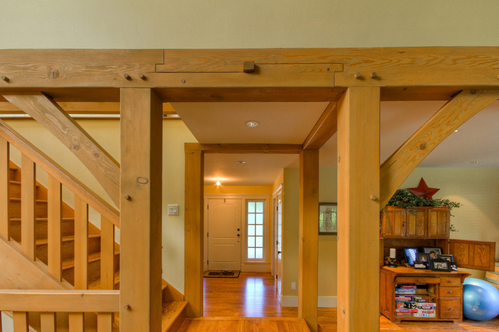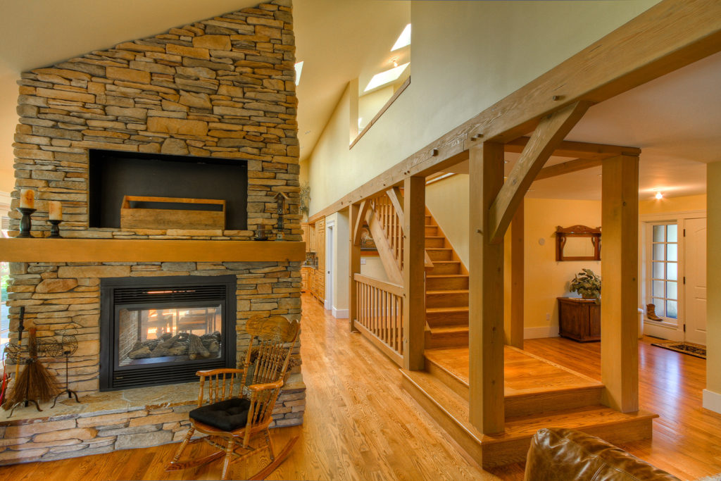 This country renovation was Kettle River Timberworks’ first project. The challenge for this project was to create a timber frame feeling with minimal timber and cost. Accomplishing this required a hybrid approach with a timbered veranda, timber porch and timbered elements within. Of interest, is the 50ft structural beam (supporting the upper floor) that was created by connecting 3 timbers together with historical ‘double bladed scarf joints’.