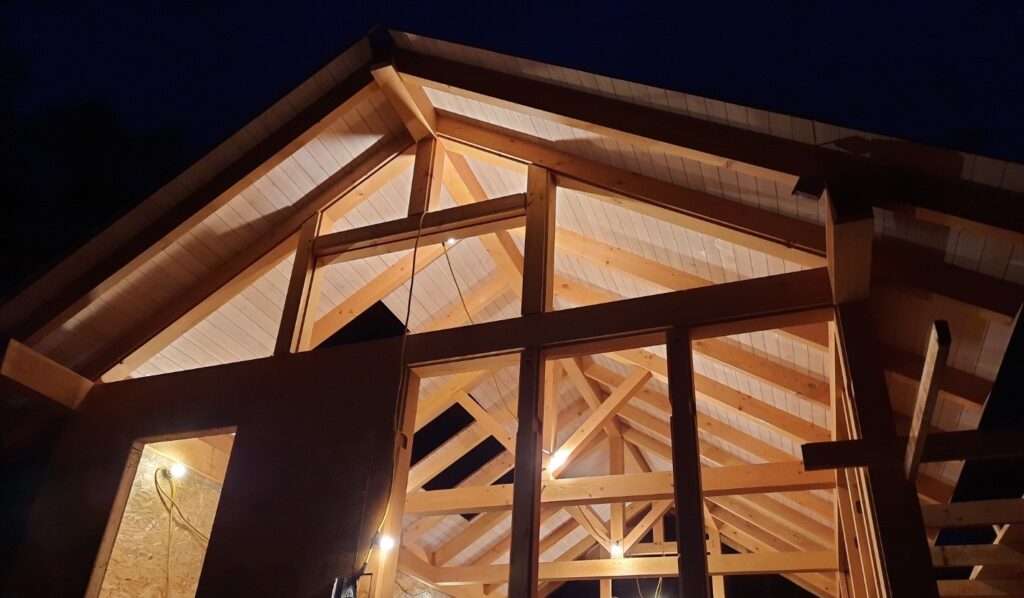 Barge & helicopter projects are always exciting for our clients and crew. Aside from the wet weather, and a few unexpected logistical hiccups (that are somehow still expected), this remote job on Lasqueti Island has been going extremely smooth! A rare dry day recently had our team working late into the night, but timbers are up and roof is on!